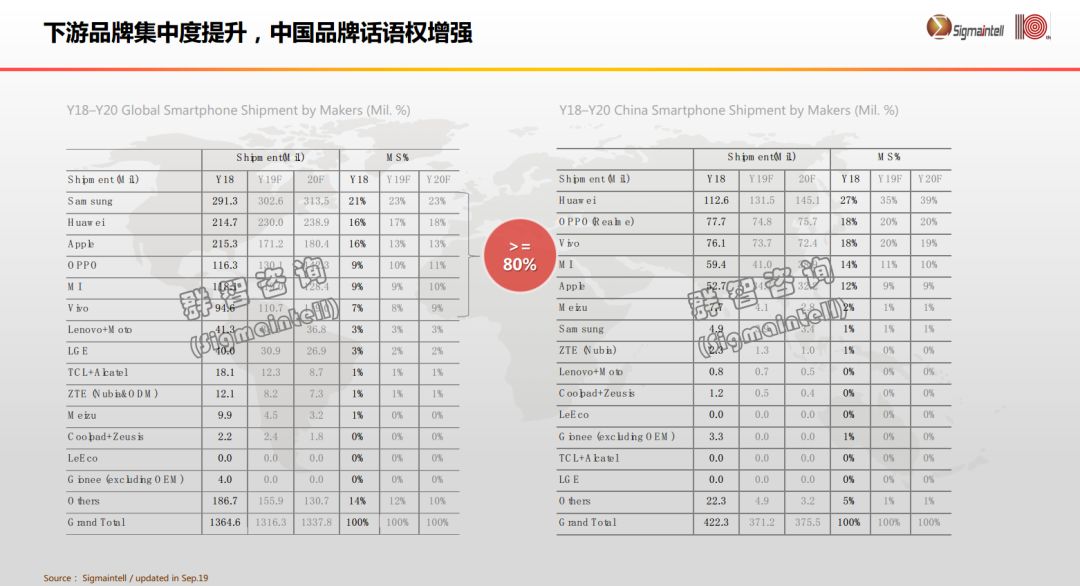 看完面板產(chǎn)業(yè)的發(fā)展現(xiàn)狀再看下游,雖然面板產(chǎn)業(yè)淘汰賽以后,話語(yǔ)權(quán)向大陸廠商轉(zhuǎn)移,那么從下游來(lái)看呢?中國(guó)大陸的面板廠商占有更高的話語(yǔ)權(quán),與此同時(shí)我們下游的品牌在集中度提高。目前手機(jī)市場(chǎng)今年前六大手機(jī)品牌占到全球80%的市場(chǎng)份額。TV市場(chǎng)也是一樣,TV市場(chǎng)在中國(guó)前六大的電視品牌占到80%的市場(chǎng)份額,接近90%。整個(gè)下游在經(jīng)濟(jì)需求比較低迷的情況下,會(huì)呈現(xiàn)集中度提高或者馬太效應(yīng),這樣對(duì)面板廠商是不利的局面,因?yàn)榭蛻羧旱脑捳Z(yǔ)權(quán)越來(lái)越強(qiáng),意味著你的議價(jià)能力被削弱。