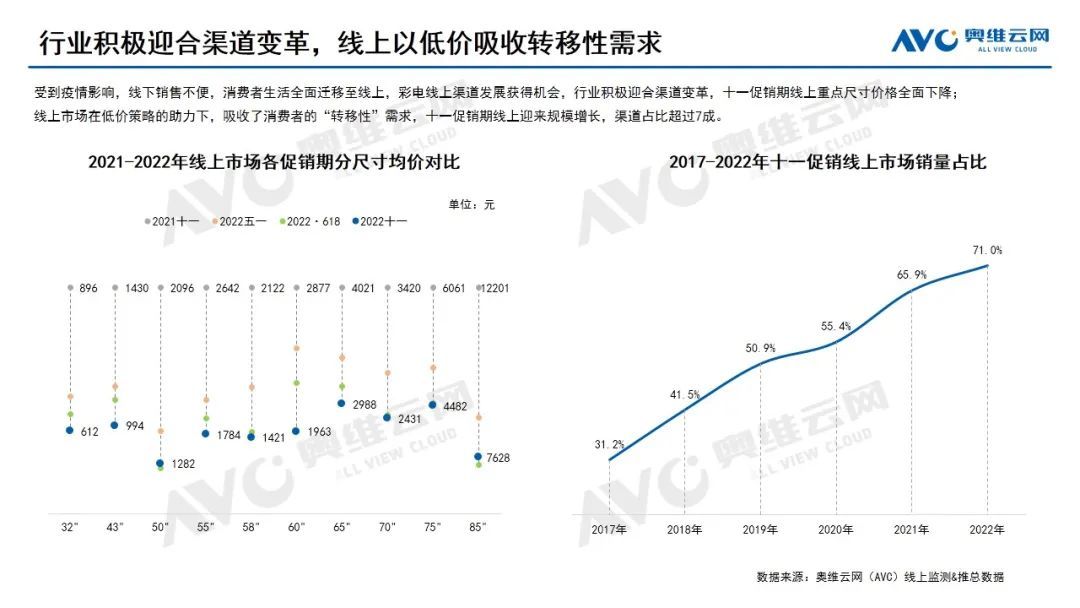 據(jù)奧維云網(wǎng)(AVC)全渠道推總數(shù)據(jù)顯示,2022年十一促銷期(22W39-22W41:22.09.19-22.10.09),中國彩電市場零售量規(guī)模為219萬臺,同比下降7.0%;零售額規(guī)模為75億元,同比下降18.0%,市場規(guī)模收縮,傳統(tǒng)節(jié)點促銷效力減弱。疫情影響下,消費者生活全面遷移至線上,中國彩電渠道加速轉(zhuǎn)型,線上市場以低價策略吸收消費者的“轉(zhuǎn)移性”需求,十一促銷期零售量占比超過7成,零售量規(guī)模同比增長1.4%。線下渠道在規(guī)模壓力之下轉(zhuǎn)型風(fēng)向明確,聚焦利潤增長,向更高價值市場轉(zhuǎn)移,市場呈現(xiàn)出高端化、品質(zhì)化、場景化的特點。