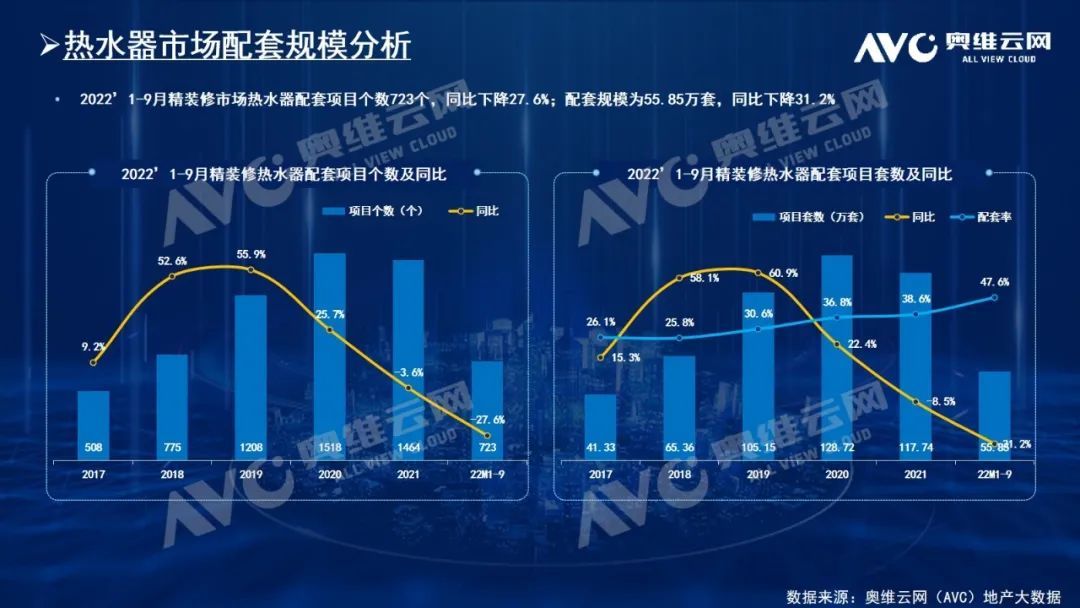 目前,受樓市管控及區(qū)域性疫情頻發(fā)的影響,房地產(chǎn)市場持續(xù)下行,據(jù)奧維云網(wǎng)(AVC)地產(chǎn)大數(shù)據(jù)顯示,2022年1-9月精裝修市場新開盤項目個數(shù)1454個,同比下降39.0%;精裝房套數(shù)108.45萬套,同比下降46.2%,熱水器作為家用電器的必備家電之一,與房地產(chǎn)市場發(fā)展走勢有著密切的聯(lián)系,在下行樓市影響下,熱水器市場規(guī)模呈現(xiàn)下滑態(tài)勢,2022年1-9月精裝修市場熱水器配套項目個數(shù)723個,同比下降27.6%;配套規(guī)模為55.8萬套,同比下降31.2%,但在下行樓市壓力下,精裝修市場熱水器整體配置率仍呈現(xiàn)積極上行趨勢,2022年1-9月熱水器配置率達47.6%,同比增長9.9%,環(huán)比增長0.9%。
