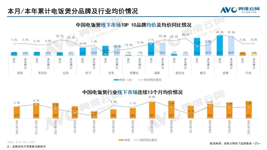小家電:據(jù)奧維云網(wǎng)(AVC)線下市場監(jiān)測數(shù)據(jù)顯示,本月小家電線下零售額規(guī)模同比-35.0%;均價為499元,同比-0.4%;高端品零售額占比6.7%,同比1.3%;各品類中,電飯煲IH加熱類型產(chǎn)品零售額占比80.7%,同比0.8%;從價格段來看,2000+的電飯煲零售額占比10.1%,同比2.7%,破壁機零售額占比8.2%,同比1.8%。