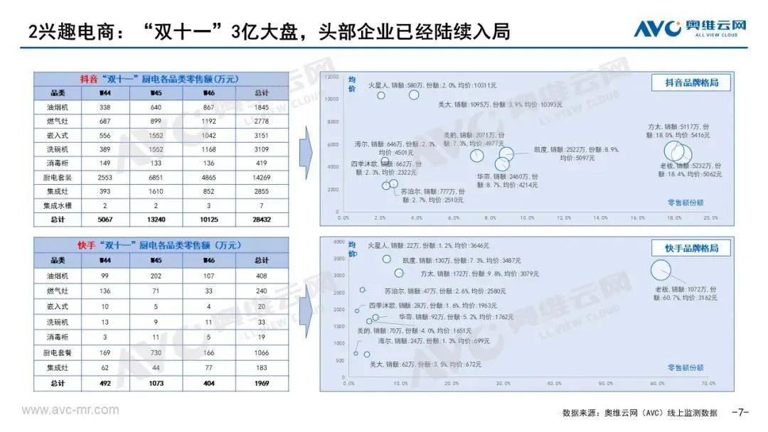 據(jù)奧維云網(wǎng)(AVC)監(jiān)測(cè)數(shù)據(jù)顯示,2022年“雙十一”大促期間抖音快手平臺(tái)廚電品類零售規(guī)模超3億元,且廚電頭部企業(yè)已經(jīng)陸續(xù)入局。其中,抖音平臺(tái)規(guī)模2.84億元,前10品牌包括老板電器、方太、凱度、華帝、美的、美大、蘇泊爾、四季沐歌、海爾、火星人;快手平臺(tái)目前規(guī)模較低,老板電器規(guī)模破千萬(wàn),均價(jià)3162元。
