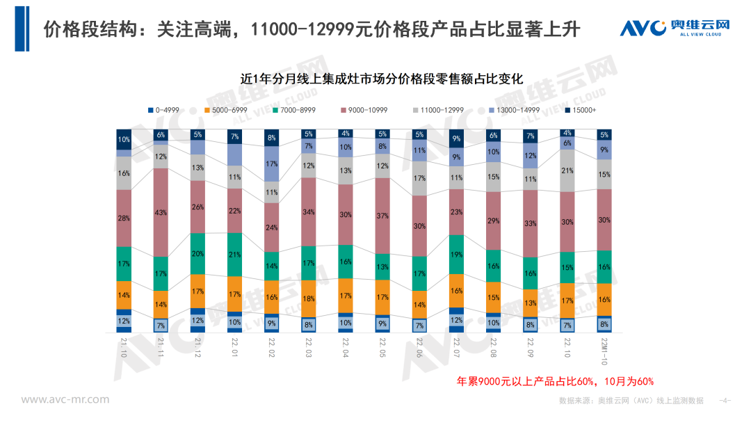 關(guān)注高端產(chǎn)品的布局,尤其是11000-12999價格段的蒸烤類集成灶:分價格段看,奧維云網(wǎng)(AVC)線上監(jiān)測數(shù)據(jù)顯示,2022年10月集成灶9000元及以上產(chǎn)品零售額結(jié)構(gòu)占比達到60%,1-10月累計占比60%。高端機型主要分布在11000-12999價格段,其零售額占比為20.7%,環(huán)比9月增長10.0%。