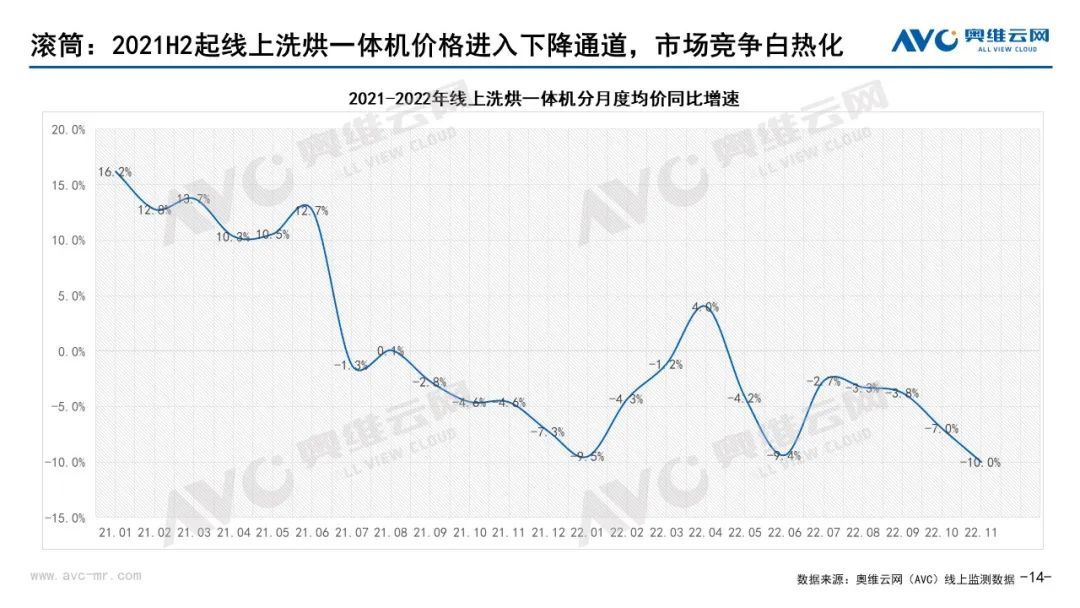 就供給端而言,在用戶需求萎縮的客觀條件下,企業(yè)的規(guī)模與經營壓力都遭遇了較大挑戰(zhàn)。企業(yè)也做出諸多努力來保證行業(yè)規(guī)模。從價格體系來看,線下經營及成本壓力提升下,產品結構升級所帶來的均價上漲依然是線下市場的主旋律。根據奧維云網(AVC)線下監(jiān)測數據,線下市場產品均價同比增長9.7%。而線上市場中,洗烘一體機的價格比拼進入白熱化,品類均價快速下探。根據奧維云網(AVC)線上監(jiān)測數據,線上洗烘一體機產品均價同比下滑5.7%,成線上市場唯一下滑的品類。