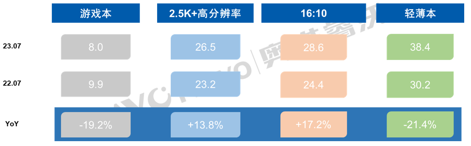 游戲本與輕薄本仍顯疲態(tài),游戲本在新硬件拉高售價(jià)的情況下銷量未能實(shí)現(xiàn)反彈,換機(jī)需求低于預(yù)期,且更多集中在促銷季,淡季市場(chǎng)對(duì)游戲本刺激力度不足,致使7月游戲本銷量同比下降19.2%,降幅增大。輕薄本市場(chǎng)需求受限,疫情期間的透支換機(jī)需求仍需時(shí)間恢復(fù),且現(xiàn)階段國內(nèi)經(jīng)濟(jì)仍不穩(wěn)定,需求恢復(fù)時(shí)間預(yù)計(jì)將進(jìn)一步延長(zhǎng),市場(chǎng)規(guī)模預(yù)計(jì)短時(shí)間難以回升,7月輕薄本整體銷量同比下降21.4%。