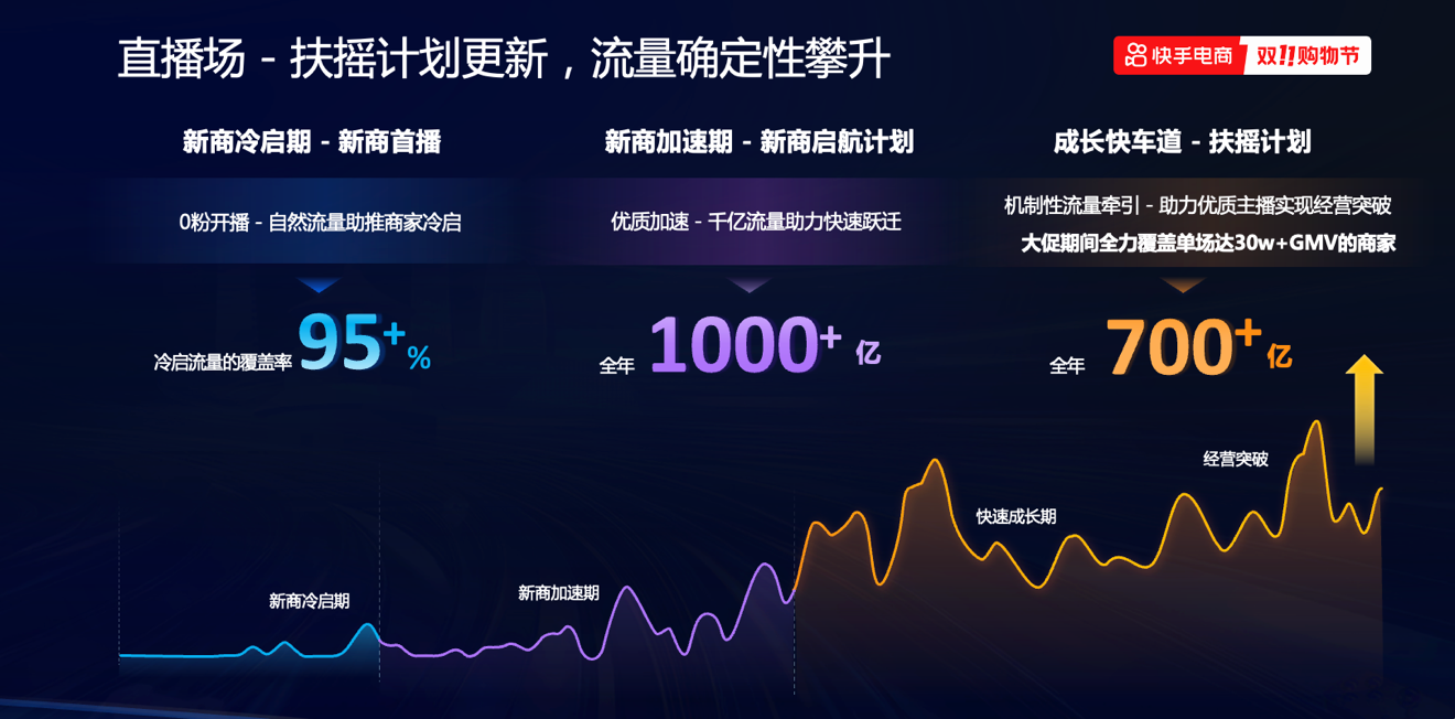 9月19日,快手電商正式啟動雙11大促招商。面向直播場域,平臺將對新商家的成長全周期提供長線扶持。在新商首播的冷啟期,平臺將通過自然流量助推商家0粉開播冷啟,冷啟流量覆蓋率超過95%。冷啟階段過后,平臺的新商起航計劃將提供全年超1000億的流量來幫助商家快速成長;當商家成長到一定階段后,扶搖計劃將提供超過700億的全年流量來牽引商家持續(xù)成長。
