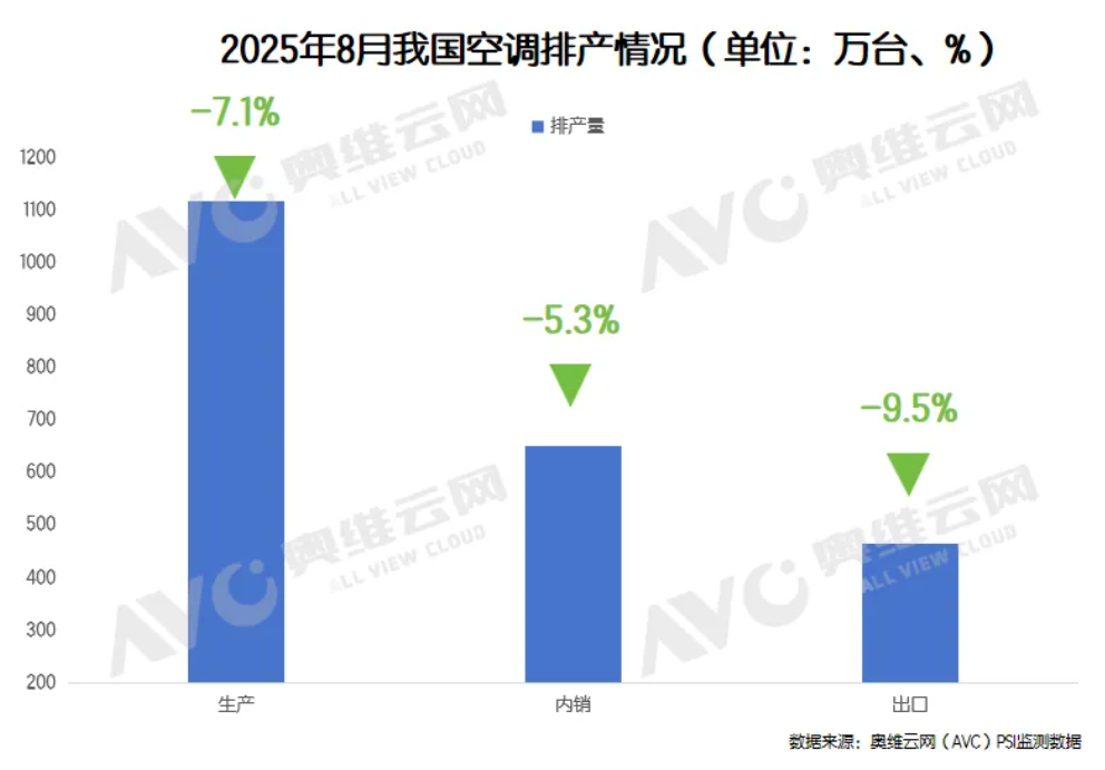 7月全國范圍持續(xù)高溫,東北地區(qū)等非傳統(tǒng)熱銷區(qū)域銷額同比暴漲378.4%,終端需求集中爆發(fā)。然而,2025年8月家用空調(diào)排產(chǎn)1115.5萬臺,同比減少7.1%,其中內(nèi)銷排產(chǎn)651萬臺,同比減少5.3%;出口排產(chǎn)464.5萬臺,同比下降9.5%,分析看主要有以下原因: