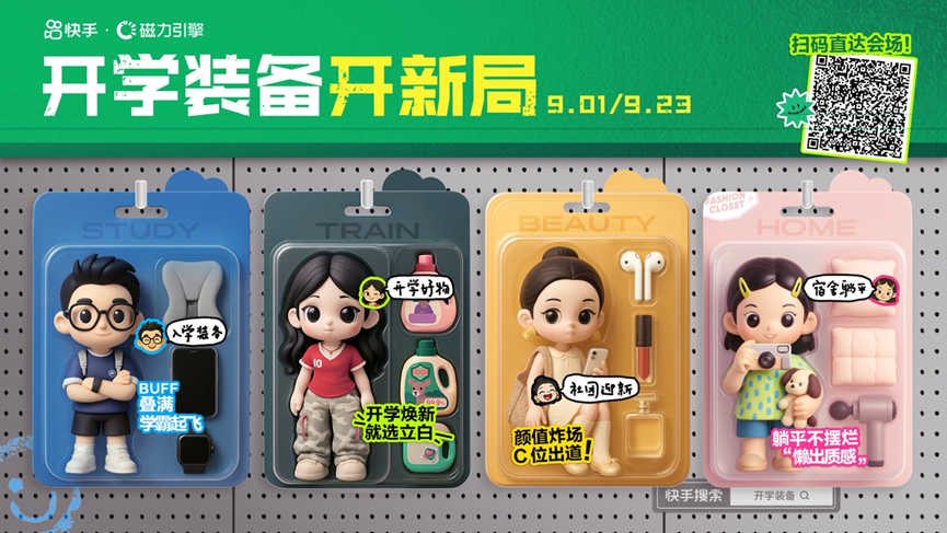 金秋九月開學季如期而至,學生及家庭采購需求不斷升溫。9月1日至23日,快手磁力引擎大快消業(yè)務(wù)中心推出“開學裝備開新局”活動,以“學生黨新裝備,開學開新局”為主題,“場景化營銷”為核心,通過百萬消返紅包、流量扶持、商業(yè)化政策疊加、抽取黃金盲盒等多元玩法及扶持,為大快消商家打造“消費洞察-生意爆發(fā)”的活動鏈路,實現(xiàn)大場聲量、話題內(nèi)容、新品轉(zhuǎn)化三重突破。