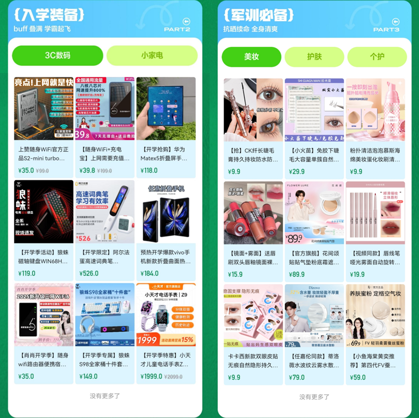 其中,軍訓場景下,面部護膚、唇部護理、廚具/杯具品類開學季GMV對比基期分別增長61%、352%、177%,商家可以備貨護膚品、保溫杯等學生剛需商品;宿舍場景下,床上用品、按摩器、個護用品GMV對比基期分別增長217%、31884%、123%,商家可以加大被子、迷你電飯煲、護具等家紡、家電、日用品品類好物備貨力度。