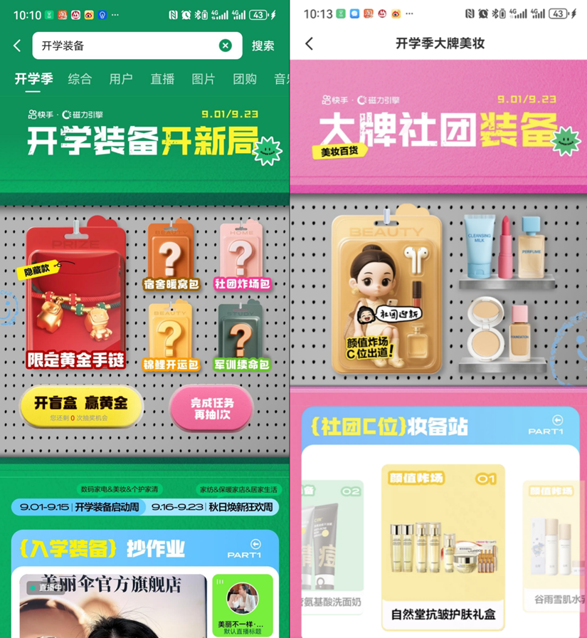 在以開學剛需商品備貨提升轉(zhuǎn)化的同時,快手大快消行業(yè)還在活動主會場及美妝分會場設(shè)置“開學抽好禮”互動玩法,通過黃金盲盒和宿舍暖窩包、社團炸場包等場景化專屬好禮抽獎,拉升活動熱度,提高品牌互動率。此外,快手特別推出紅包激勵、新品專屬扶持、發(fā)話題贏流量、增值權(quán)益、新品營銷IP等豐富玩法,全方位助力商家引爆開學季生意增長。