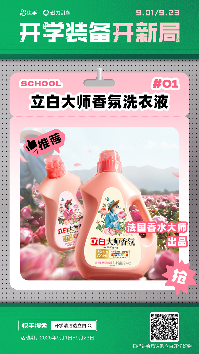 為助力商家高效沉淀品效資產(chǎn),快手平臺還提供品聚合作增值權(quán)益,以豐富活動權(quán)益加持,疊加同期多重政策,提升品牌人群轉(zhuǎn)化,助力生意長效增長。@立白官方旗艦店 作為活動的開學開新旗艦官,借助開學節(jié)點推出立白大師香氛洗衣液產(chǎn)品,為青春加“氛”。