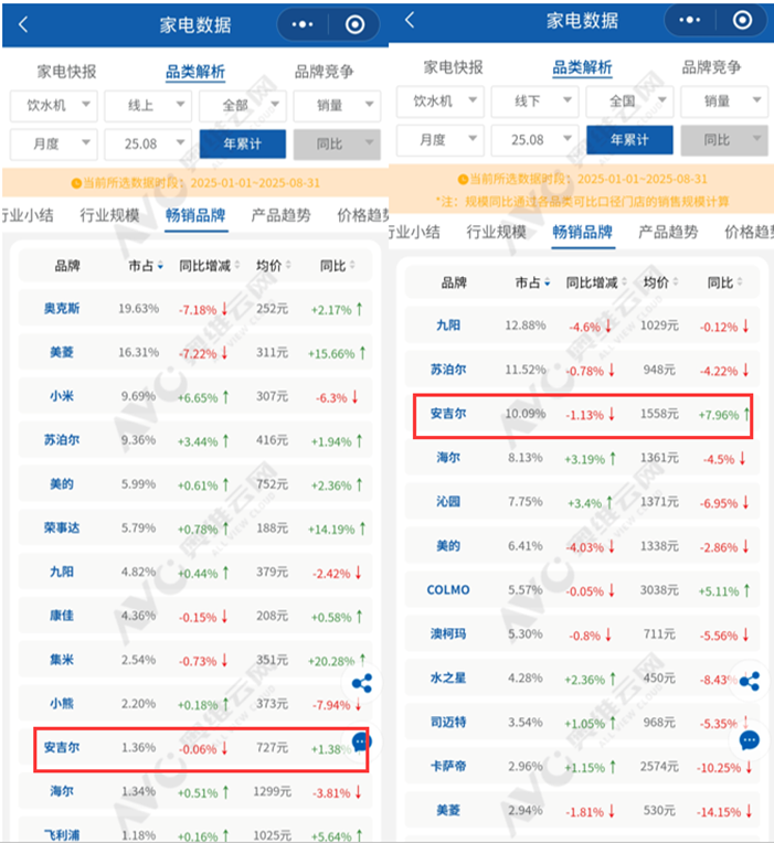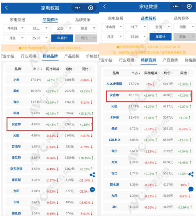 奧維云網(wǎng)2025年1-8月數(shù)據(jù)顯示,凈水器線上銷量同比增長1.78%,線下則下降1.52%,消費主場持續(xù)向線上遷移。從品牌格局看,安吉爾在凈水器線下市場表現(xiàn)穩(wěn)健,市占率達16.16%,位列第二,同比增長2.64%,均價也上漲8.19%至4830元,顯示出其在高端市場的影響力。