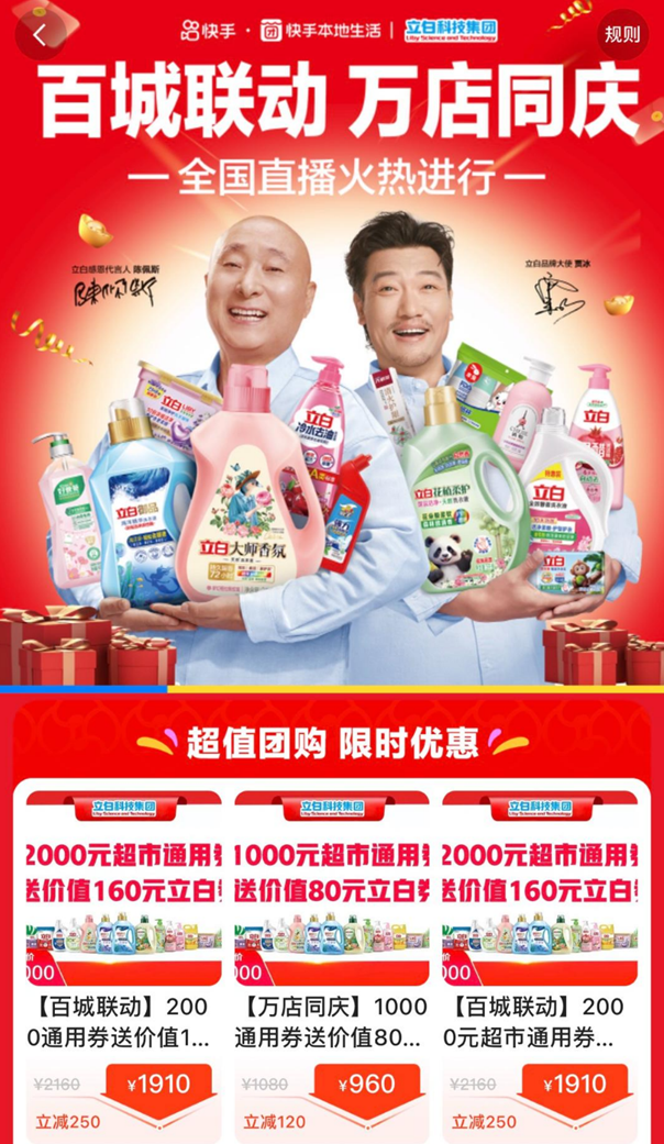 在本地團(tuán)購(gòu)場(chǎng)景內(nèi),快手助力立白打造本地“百城聯(lián)動(dòng)”團(tuán)購(gòu)節(jié),讓品牌對(duì)百城萬(wàn)家的潔凈守護(hù)真正走進(jìn)用戶生活,本地經(jīng)營(yíng)活動(dòng)周期助力轉(zhuǎn)化交易突破4億,百城聯(lián)動(dòng)合作超市品牌223個(gè),全國(guó)覆蓋門店1747家。快手站內(nèi)搭建起立白“百城聯(lián)動(dòng) 萬(wàn)店同慶”本地團(tuán)購(gòu)節(jié)主會(huì)場(chǎng),并合作區(qū)域達(dá)人、聯(lián)動(dòng)品牌直播,串聯(lián)起內(nèi)容種草、直播轉(zhuǎn)化、本地團(tuán)購(gòu)的閉環(huán)鏈路,使用戶體驗(yàn)由內(nèi)容情感共鳴向生活服務(wù)拓展,助力品牌以線上曝光引燃線下生意增量。