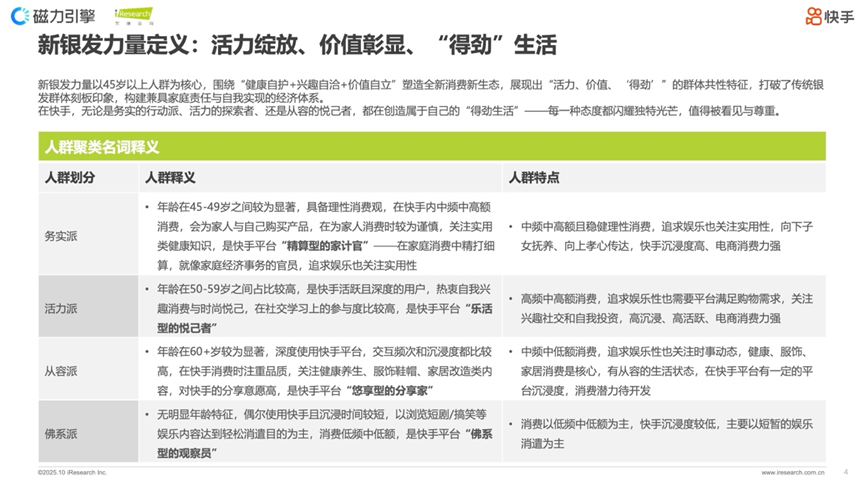 近日,快手磁力引擎聯(lián)合艾瑞咨詢發(fā)布《2025快手新銀發(fā)人群洞察報(bào)告》(以下簡(jiǎn)稱“報(bào)告”),揭示了“新銀發(fā)”群體如何以“得勁”為生活哲學(xué),驅(qū)動(dòng)著萬(wàn)億級(jí)的消費(fèi)市場(chǎng)變革。