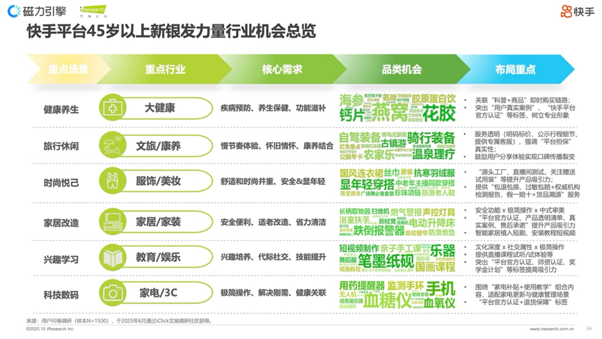 從消費(fèi)決策鏈路來(lái)看,新銀發(fā)人群重點(diǎn)關(guān)注的是內(nèi)容吸引、決策安全、高性價(jià)比和品質(zhì)體驗(yàn)。而在消費(fèi)品類(lèi)選擇上,他們更關(guān)注“實(shí)用品質(zhì)與情感價(jià)值”,催生出健康養(yǎng)生、旅游休閑、時(shí)尚悅己、家居改造、興趣學(xué)習(xí)、科技數(shù)碼等高潛力賽道。