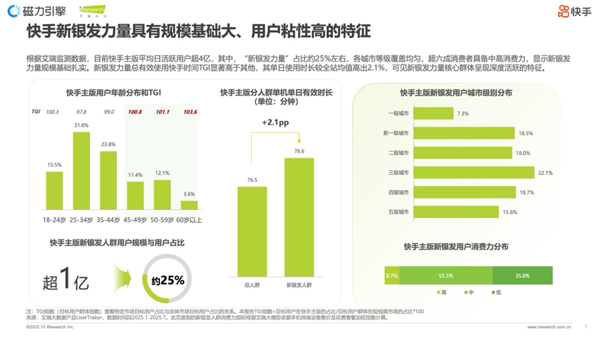 報(bào)告顯示,快手新銀發(fā)用戶規(guī)?;A(chǔ)大、粘性高,快手主版“新銀發(fā)人群”(45歲+)規(guī)模超1億,在總用戶中占比約25%,近七成月均22天以上使用快手,單日使用時(shí)長(zhǎng)較全站均值高出2.1%。