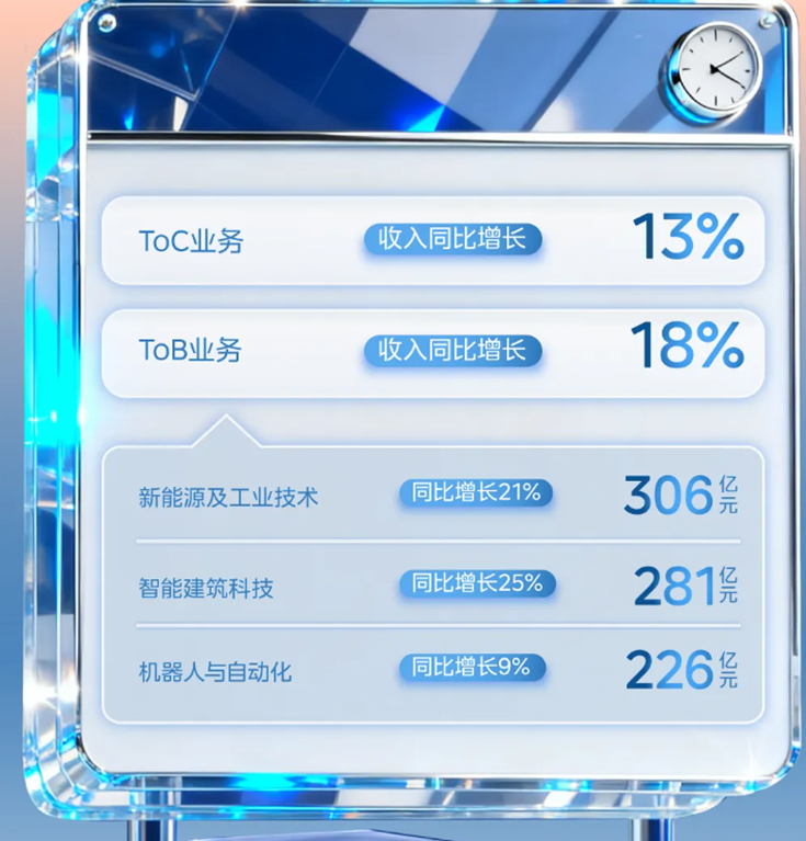 從業(yè)務(wù)結(jié)構(gòu)看,美的集團(tuán)的B端業(yè)務(wù)已成為重要的增長(zhǎng)引擎。前三季度,公司To B業(yè)務(wù)收入同比增長(zhǎng)18%,明顯高于To C業(yè)務(wù)的增速。其中,新能源及工業(yè)技術(shù)收入306億元,同比增長(zhǎng)21%;智能建筑科技收入81億元,同比增長(zhǎng)25%;機(jī)器人與自動(dòng)化收入226億元,同比增長(zhǎng)9%。這些數(shù)據(jù)表明,美的在多元化戰(zhàn)略布局上已初見成效。