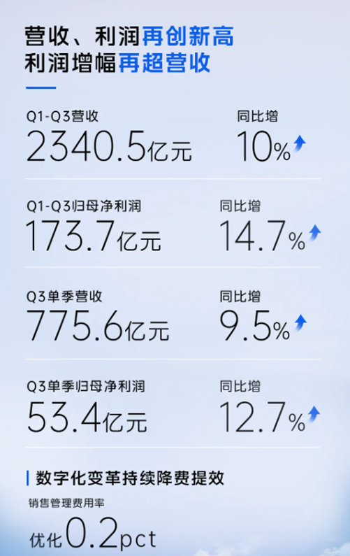 海爾智家今年前三季度實(shí)現(xiàn)了營(yíng)業(yè)收入2340.5億元,同比增長(zhǎng)10%;歸母凈利潤(rùn)173.7億元,同比增長(zhǎng)14.7%,創(chuàng)下歷史新高。第三季度單季,公司營(yíng)業(yè)收入775.6億元,同比增長(zhǎng)9.5%;歸母凈利潤(rùn)53.4億元,同比增長(zhǎng)12.7%。海爾智家通過持續(xù)推進(jìn)數(shù)字化轉(zhuǎn)型與高端品牌建設(shè),實(shí)現(xiàn)了利潤(rùn)增速高于收入增速的良好態(tài)勢(shì)。