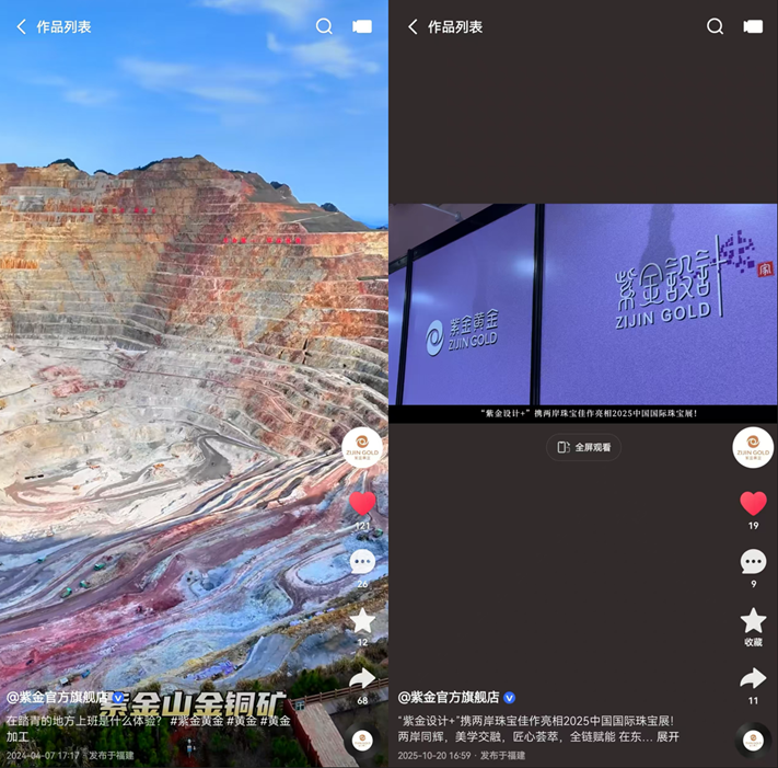 為迅速承接并轉(zhuǎn)化已觸達的潛在客群,入局初期,紫金黃金將漲粉作為短視頻和自播間運營的關(guān)鍵指標,通過展示礦山開采、冶煉加工等上游環(huán)節(jié),以及品牌領(lǐng)導(dǎo)出席行業(yè)大會的記錄等品宣向內(nèi)容,將抽象的品牌實力轉(zhuǎn)化為具象的視覺呈現(xiàn),進一步夯實用戶信任,將“流量”轉(zhuǎn)化為“留量”。