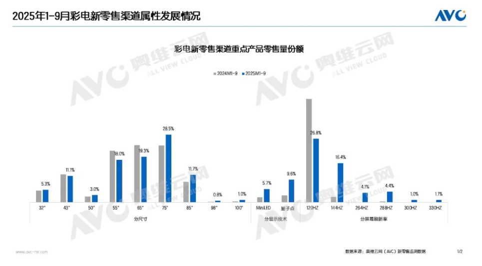 1. 大尺寸化已成剛需,75英寸穩(wěn)居銷量主力,85英寸及以上超大屏產(chǎn)品增速領(lǐng)跑,98英寸、100英寸產(chǎn)品份額持續(xù)突破;