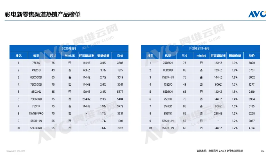 奧維云網(wǎng)(AVC)新零售監(jiān)測(cè)數(shù)據(jù)顯示,2025年1-9月彩電新零售渠道零售量規(guī)模為51.2萬(wàn)臺(tái),同比+55.8%;零售額規(guī)模為20.2億元,同比+42.3%。