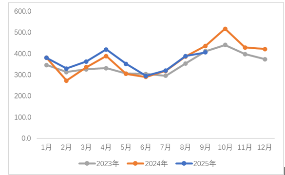 2023年-2025年9月洗衣機行業(yè)內銷月度季節(jié)特征(萬臺)