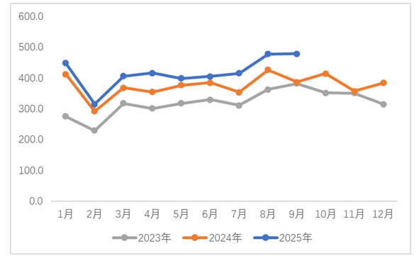 2023年-2025年9月洗衣機行業(yè)出口月度季節(jié)特征(萬臺)