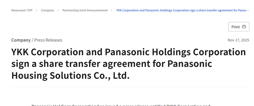 近日,松下控股宣布將旗下建材子公司Panasonic Housing Solutions(簡稱“PHS”)80%股權(quán)出售給日本建材巨頭YKK集團,這一交易預(yù)計2026年3月底完成,2026年4月起PHS將以新體制運作。