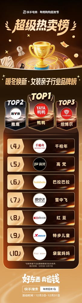 12月3日-12月17日,鴨鴨、雅鹿、坦博爾、千柏年、高梵、巴拉巴拉、雪中飛、紅豆、特步兒童、袋鼠媽媽成為快手女裝親子行業(yè)TOP 10熱銷品牌。