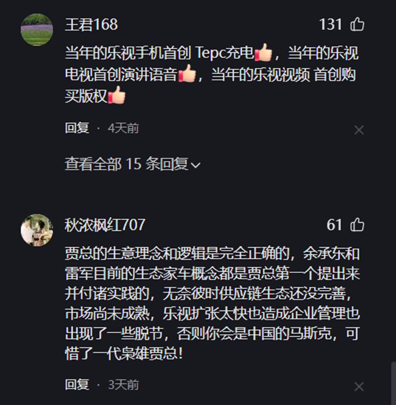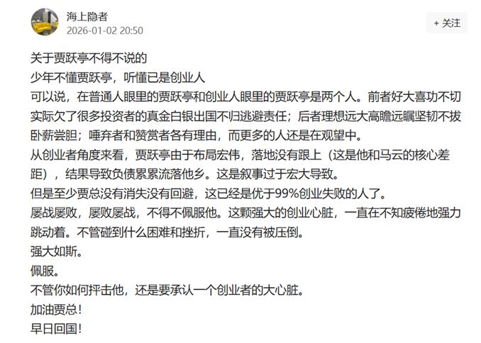一位自稱創(chuàng)業(yè)者的用戶分享道:“少年不懂賈躍亭,聽懂已是創(chuàng)業(yè)人?!边@句話被反復(fù)引用,成為許多評(píng)論的注腳。突然之間,賈躍亭的形象從一個(gè)“失敗的商人”轉(zhuǎn)變?yōu)榱恕皥?jiān)韌的追夢(mèng)者”。