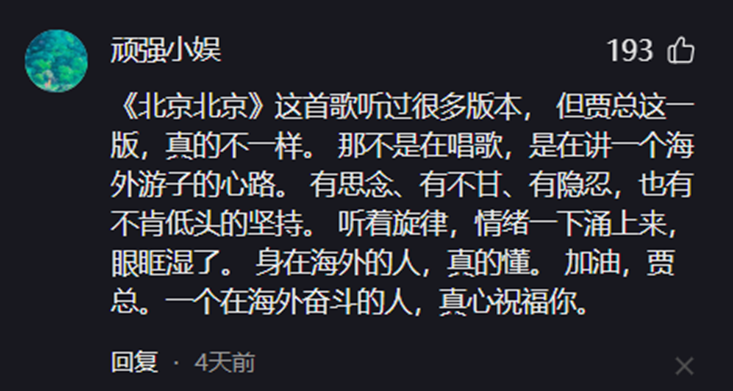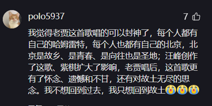 在賈躍亭翻唱《北京北京》的語境中,“北京”已不僅是一個(gè)地理概念,而成為故鄉(xiāng)、青春、理想和遺憾的多重象征。“每個(gè)人都有自己的哈姆雷特,每個(gè)人也都有自己的北京,北京是故鄉(xiāng)、是青春、是向往也是圣地?!币粭l評(píng)論如此解讀。