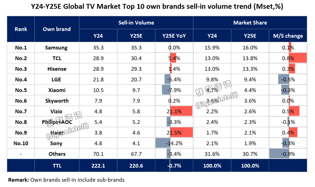 LG電視業(yè)務(wù)的困境,很大程度上源于中國競爭對(duì)手的強(qiáng)勢擠壓。釘科技注意到,群智咨詢、奧維睿沃等機(jī)構(gòu)數(shù)據(jù)顯示,2024年以來TCL、海信等中國品牌已在全球電視出貨量上超越LG,其市場份額面臨持續(xù)下滑的危機(jī)。