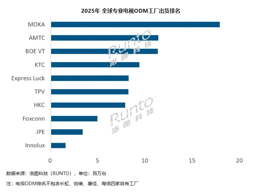 在代工廠格局方面,2025年出現(xiàn)明顯分化。釘科技注意到,擁有面板資源的企業(yè)占據(jù)了明顯優(yōu)勢。茂佳(MOKA)2025年出貨量約為1790萬臺,同比2024年增長6.9%,領先優(yōu)勢高達約600萬臺,連續(xù)第三年奪得總量冠軍,展現(xiàn)其規(guī)模與交付能力的穩(wěn)定性。而BOE VT(京東方視訊)則以高達37.5%的顯著增速成為年度“增長冠軍”,顯示其在客戶拓展與產(chǎn)能釋放上的強勁動力。