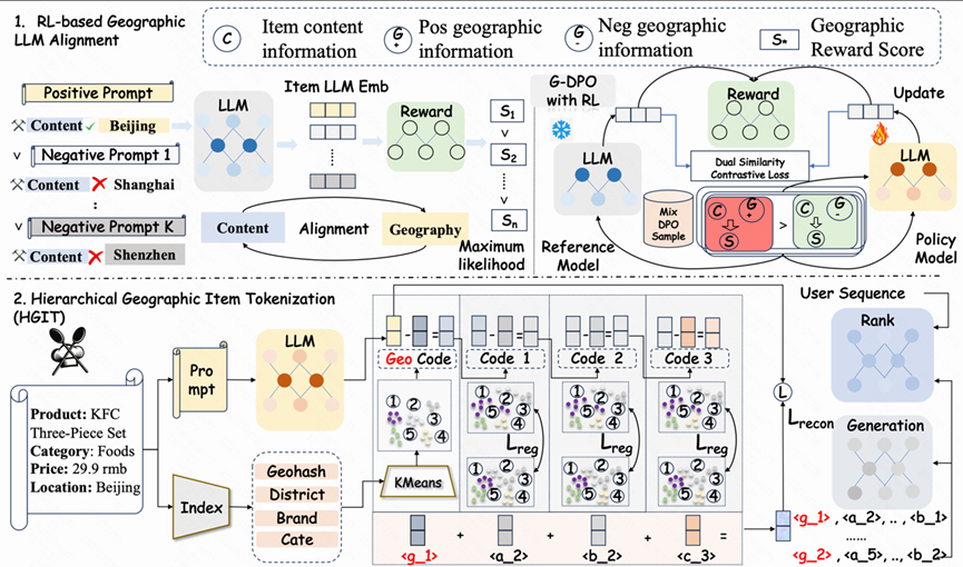 只有同時滿足“離得近”和“感興趣”,推薦結(jié)果才有可能轉(zhuǎn)化為線下到店與交易。因此,快手生活服務(wù)算法團(tuán)隊引入大語言模型對Item進(jìn)行高質(zhì)量的文本語義與地理語義聯(lián)合偏好建模,并通過基于強(qiáng)化學(xué)習(xí)的后訓(xùn)練范式,緩解預(yù)訓(xùn)練 LLM 中普遍存在的“重語義、輕地理”先天偏置,從而使內(nèi)容表征更加充分地適配生活服務(wù)推薦場景。