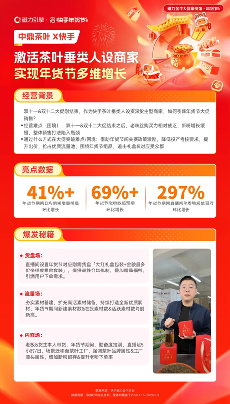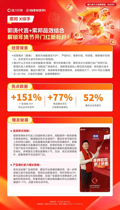 對于面臨增長瓶頸的商家而言,年貨節(jié)是打破銷量桎梏、突破獲客困境的核心契機??焓执帕σ嫱ㄟ^品廣協(xié)同、明星賦能、精準投流等組合策略,幫助商家打通“蓄水-爆發(fā)-沉淀”全鏈路,實現(xiàn)品效合一,驗證了大促期間高效增長的可行路徑。