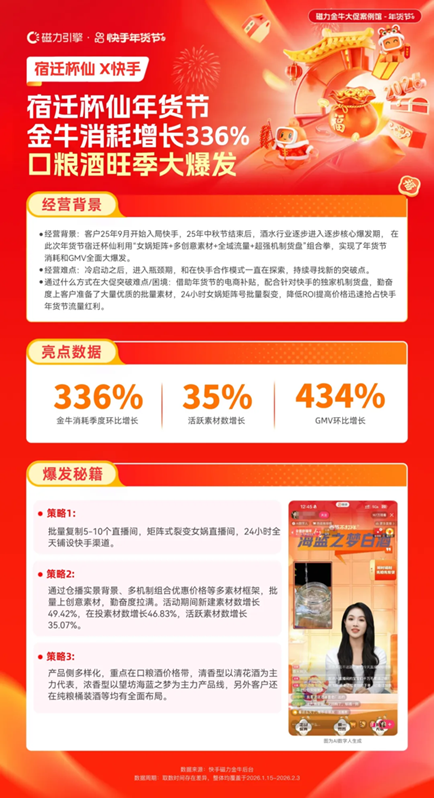 宿遷杯仙入局快手后進入瓶頸期,亟需尋找經(jīng)營突破點。借助快手年貨節(jié)契機,采用“女媧矩陣+多創(chuàng)意素材+全域流量”組合拳,批量復(fù)制直播間實現(xiàn)24小時全域鋪設(shè),優(yōu)化素材與貨盤布局,重點發(fā)力口糧酒賽道。年貨節(jié)期間金牛消耗季度環(huán)比增長336%,GMV環(huán)比增長433.97%,實現(xiàn)冷啟動后的全面爆發(fā)。
