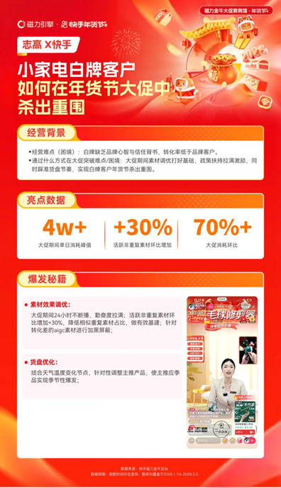 志高作為小家電白牌商家,缺乏品牌心智與信任背書,轉(zhuǎn)化率低于品牌客戶,面臨年貨節(jié)突圍難題。借助快手磁力引擎,大促期間24小時不斷播拉滿直播勤奮度,優(yōu)化素材結(jié)構(gòu)、提升素材質(zhì)量;同時結(jié)合天氣變化調(diào)整主推應(yīng)季產(chǎn)品。最終大促期間單日消耗峰值超4萬,活躍非重復(fù)素材環(huán)比增加30%,消耗環(huán)比增長超70%,成功實現(xiàn)白牌突圍。