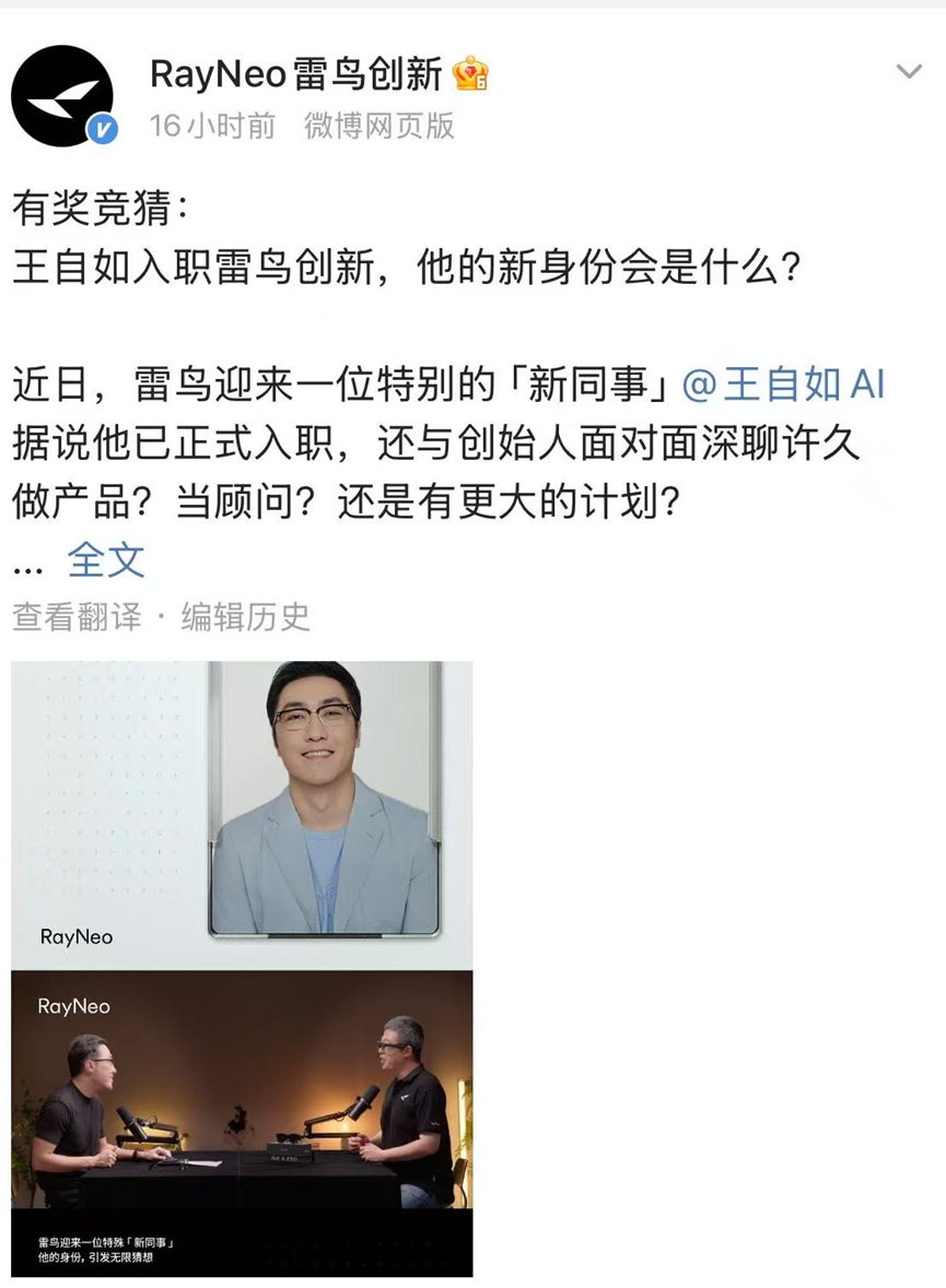 10月20日,雷鳥創(chuàng)新官方宣布王自如正式加入公司。這一消息迅速在科技圈傳播開來。釘科技注意到,王自如將于10月23日亮相雷鳥AR眼鏡新品發(fā)布會,參與RayNeo Air 4的發(fā)布活動。