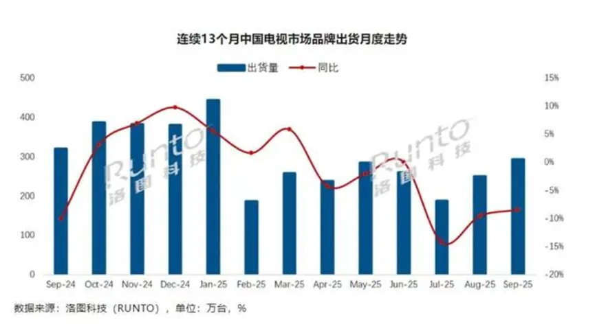 中國彩電市場正經(jīng)歷一場不容樂觀的“寒流”。洛圖科技最新數(shù)據(jù)顯示,9月國內(nèi)電視市場出貨量292.0萬臺(tái),較去年同期下滑8.5%,這已是第三季度連續(xù)第三個(gè)月出現(xiàn)同比下滑。累計(jì)來看,前三季度整體市場規(guī)模同比收縮2.5%,行業(yè)承壓態(tài)勢持續(xù)加劇。