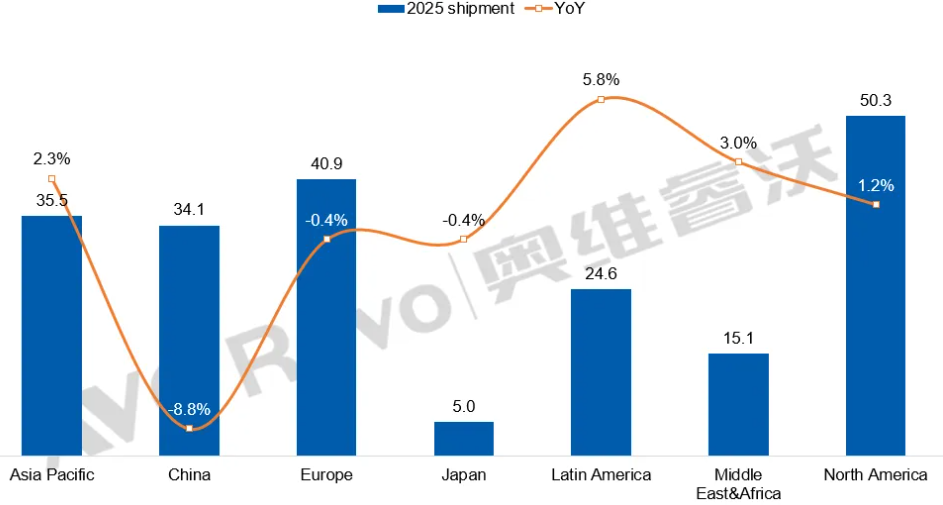 縱觀全年,發(fā)達市場北美出貨增長1.2%,歐洲、日本出貨均下降0.4%;新興市場亞太、拉美、中東非出貨分別增長2.3%、5.8%、3.0%;中國市場2025年出貨下降8.8%。