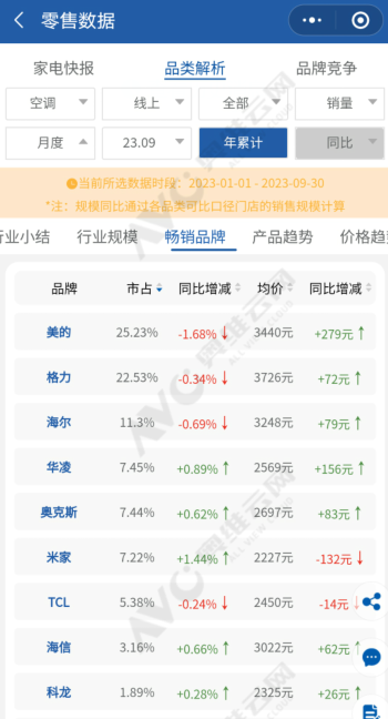 從品牌格局來(lái)看,奧維云網(wǎng)數(shù)據(jù)顯示,1-9月線(xiàn)上銷(xiāo)量市占率Top5品牌分別為美的、格力、海爾、華凌、奧克斯;線(xiàn)上市場(chǎng)大體維持著頭部品牌市占率下降,二三線(xiàn)品牌市占率上升的態(tài)勢(shì)。