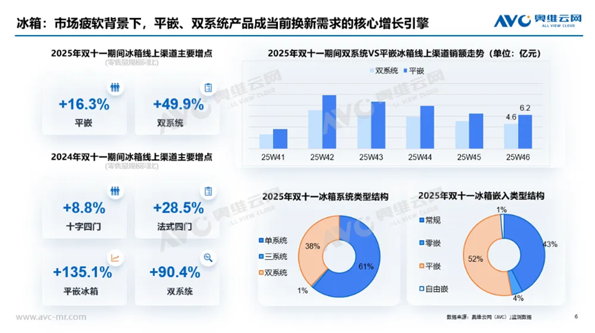 冰箱領(lǐng)域則呈現(xiàn)雙重突破。釘科技注意到,雙系統(tǒng)產(chǎn)品通過精準(zhǔn)溫區(qū)控制滿足食材保鮮細分需求,而平嵌設(shè)計則以無邊界美學(xué)打破傳統(tǒng)冰箱的空間局限,兩者分別實現(xiàn)49.9%和16%的同比增長。
