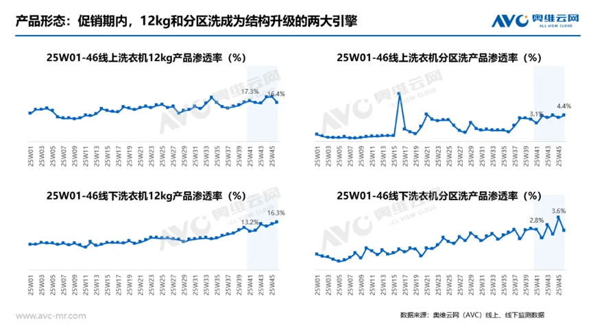 洗護品類中,多筒分區(qū)洗洗衣機展現(xiàn)出明顯優(yōu)勢。釘科技注意到,雙十一期間,12kg大容量與分區(qū)洗功能滲透率顯著提升,以統(tǒng)帥、美的、小米為代表的"三區(qū)洗"一體化產(chǎn)品競爭尤為激烈。值得注意的是,中高端價格帶(4000-6000元)的滲透率持續(xù)攀升,反映出消費者愿意為功能細分和效率提升支付溢價。這種結(jié)構(gòu)性增長不僅體現(xiàn)在產(chǎn)品層面,更倒逼產(chǎn)業(yè)鏈在智能制造、場景化服務(wù)等領(lǐng)域加速布局。