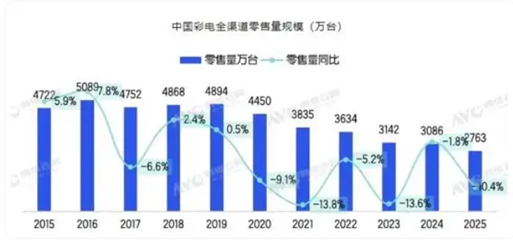 2025年,美國(guó)電視的銷(xiāo)量是4990萬(wàn)臺(tái),中國(guó)銷(xiāo)量是3289.5萬(wàn)臺(tái)。這樣的數(shù)據(jù)對(duì)比,非常刺眼。要知道,2016中國(guó)電視市場(chǎng)的銷(xiāo)量超過(guò)了5000萬(wàn)臺(tái),十年減少了2000萬(wàn)的銷(xiāo)量,非常驚人。