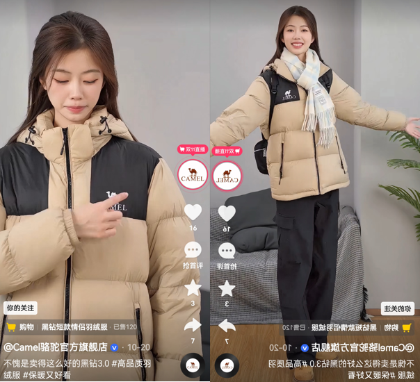 上半年駱駝主要銷售重點(diǎn)品類為沖鋒衣。“駱駝沖鋒衣在快手已經(jīng)建立起較強(qiáng)的品牌認(rèn)知,因此在8月份之前我們保持沖鋒衣與羽絨服各占一半的貨盤結(jié)構(gòu)。入秋之后,羽絨服的銷售表現(xiàn)持續(xù)走強(qiáng),我們果斷轉(zhuǎn)向全力主推羽絨服,并通過短視頻種草持續(xù)強(qiáng)化這一品類。”