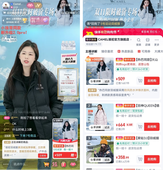 入冬以來寒潮推高了市場的消費(fèi)熱度,點(diǎn)燃了用戶對羽絨服品類的選購熱情。國民戶外品牌駱駝精準(zhǔn)抓住這一時機(jī),在快手雙11大促中實(shí)現(xiàn)自播業(yè)務(wù)的關(guān)鍵突破。雙11期間,駱駝官方旗艦店曾連續(xù)兩天創(chuàng)下運(yùn)動戶外類目自播新紀(jì)錄,登頂男裝品牌榜單TOP1。其核心單品黑鉆3.0羽絨服表現(xiàn)亮眼,單款GMV破千萬,成為拉動整體增長的強(qiáng)力引擎。