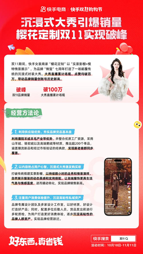 數(shù)據(jù)顯示,這場直播場觀達到了100多萬,點贊數(shù)也突破百萬,遠高于“櫻花定制高端服飾”平時開播的水平。安然表示:“最讓我們感動的是公屏上的評論,很多人說‘我很久沒打開快手了,因為這場秀讓我眼前一亮,又回來了’,這正是我們想要的效果?!?/p>