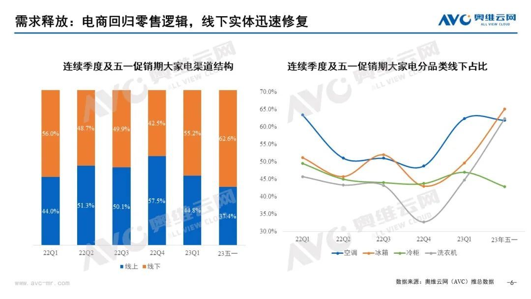 奧維云網(wǎng)(AVC)推總數(shù)據(jù)顯示,除冷柜外,冰洗空大家電的五一需求釋放水平不足2019年的85%。盡管規(guī)模修復(fù)仍有一定壓力,但市場(chǎng)仍維持著基本的競(jìng)爭(zhēng)理性,尤其是線下市場(chǎng),重點(diǎn)品類的價(jià)格在五一期間保持了一定的增長(zhǎng)慣性。從渠道結(jié)構(gòu)看,線下實(shí)體經(jīng)濟(jì)有效恢復(fù),帶動(dòng)大家電市場(chǎng)線下占比穩(wěn)步回升。奧維云網(wǎng)(AVC)推總數(shù)據(jù)顯示,五一促銷期,冰洗空線下零售額占比均超過(guò)60%。