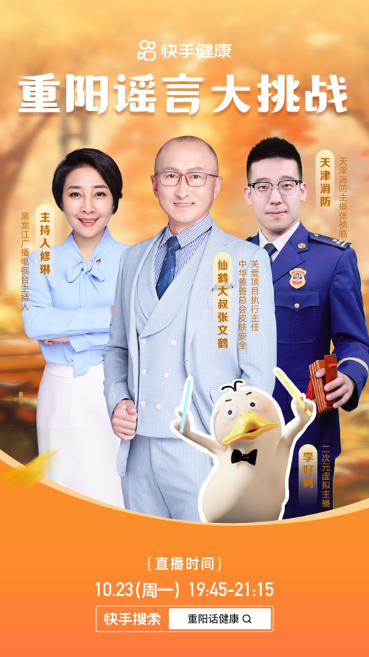 此外,還有許多熱心的專業(yè)醫(yī)生為快手老年用戶帶來特色健康直播,@仙鶴大叔張文鶴便攜手@天津消防 、@主持人修琳 ,用幽默風趣的內容,一起暢聊老人日常健康生活息息相關的疾病、慢性病和生活方式等話題,幫助銀齡人群健康過重陽。