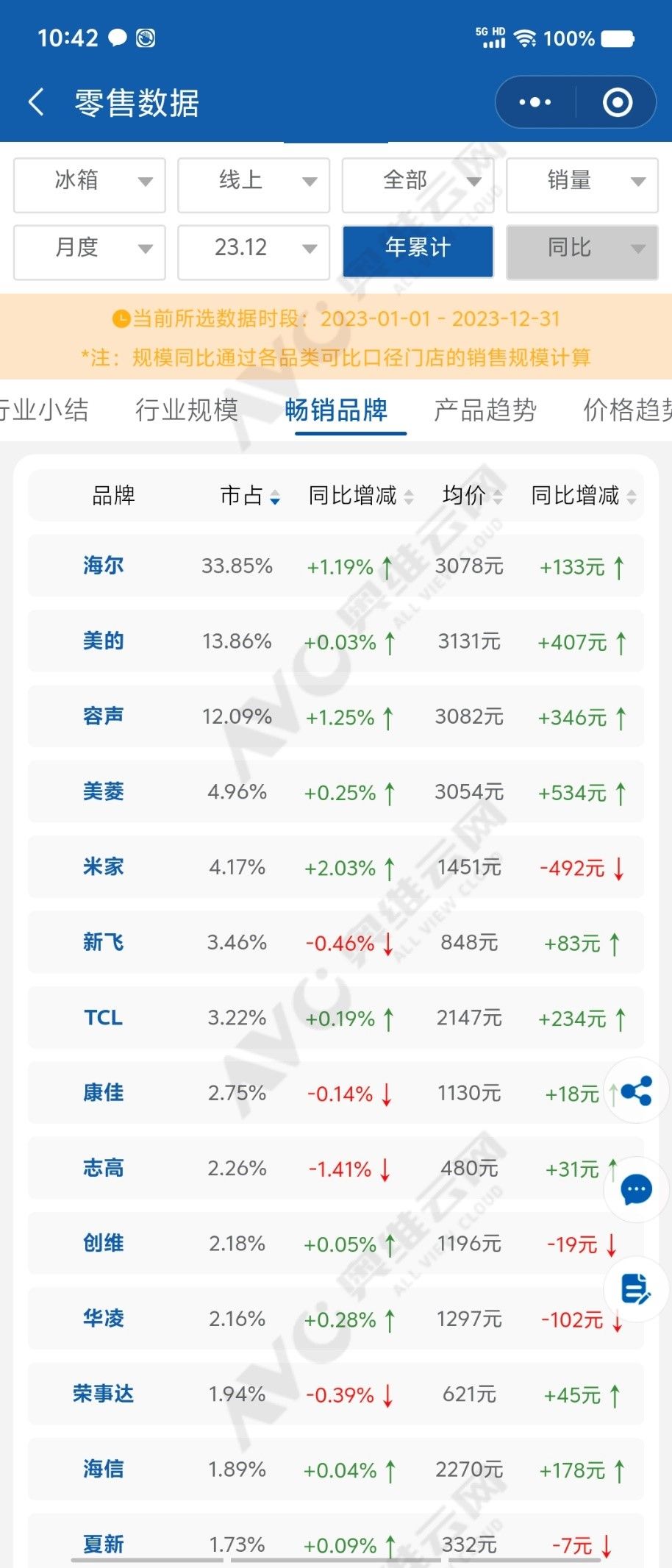 根據(jù)奧維云網(wǎng)的推總數(shù)據(jù),2023年冰箱市場的零售額規(guī)模達(dá)到了1333億元,同比增長7.0%,零售量達(dá)到3831萬臺,同比增長1.5%;預(yù)計2024年冰箱市場零售額1346億元,同比增長1.0%,零售量3873萬臺,同比增長1.1%。在大家電行業(yè),冰箱市場保持了難得的“小步慢跑”的增長趨勢。在這樣的背景下,容聲、美的等品牌依然有繼續(xù)向上增長的空間。