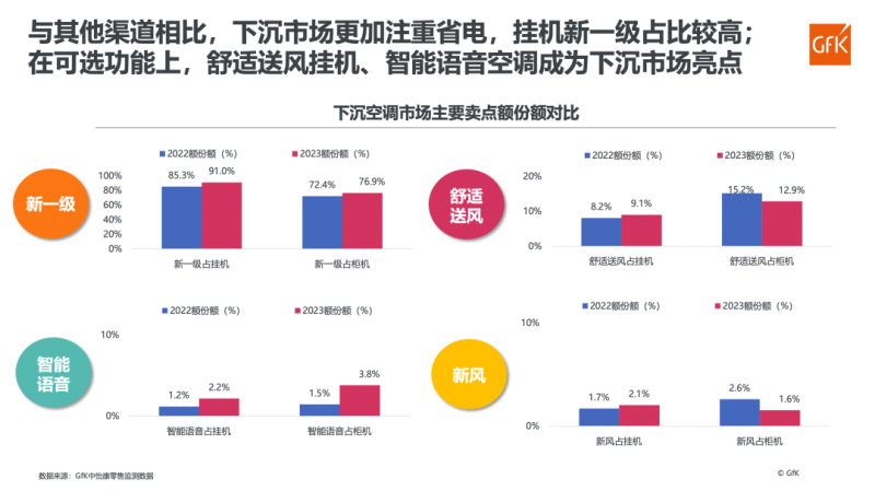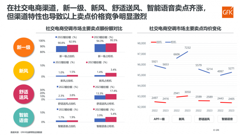 從以上數(shù)據(jù)不難發(fā)現(xiàn),新風(fēng)空調(diào)在增長迅猛的社交電商渠道和下沉渠道,滲透率低于整體市場。對比來看,智能語音、舒適送風(fēng)兩大賣點(diǎn),在這兩大渠道更受消費(fèi)者的歡迎。